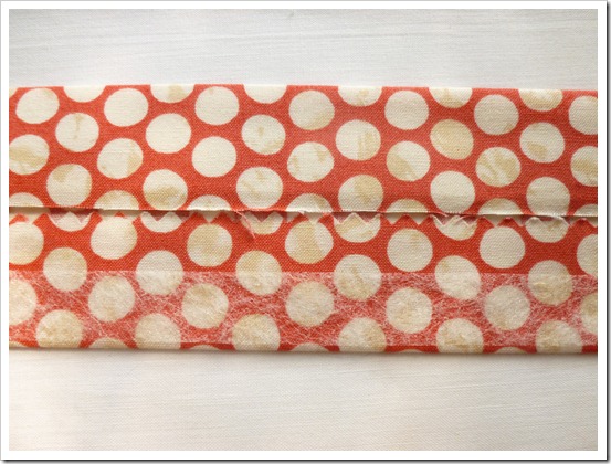 Now on one edge, lay another strip of your adhesive and fold the fabric lengthwise again. Now you have a strip of fabric with no raw edges showing (except for the ends.)
