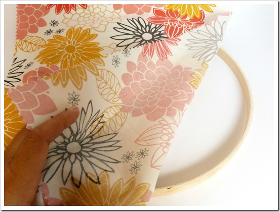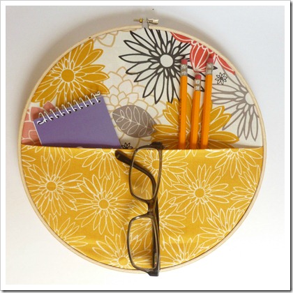 Slip on the outer hoop and tighten. Gently tug the fabric around the edges to make it taut inside of the hoop. This is the part where you make sure you are happy with the placement of your pocket or how the print on your fabric is situated. If not, do it over again, this is a very forgiving project. If you’d like, you can add a couple vertical stitches down the pocket for pencils or one in the middle to divide the pocket into two. This, of course, would be done before you place the fabric in the hoop. When you are satisfied with it you can cut the excess fabric or tuck it behind the hoop. Be sure to tighten your hoop real tight so that the fabric doesn’t slip out.
